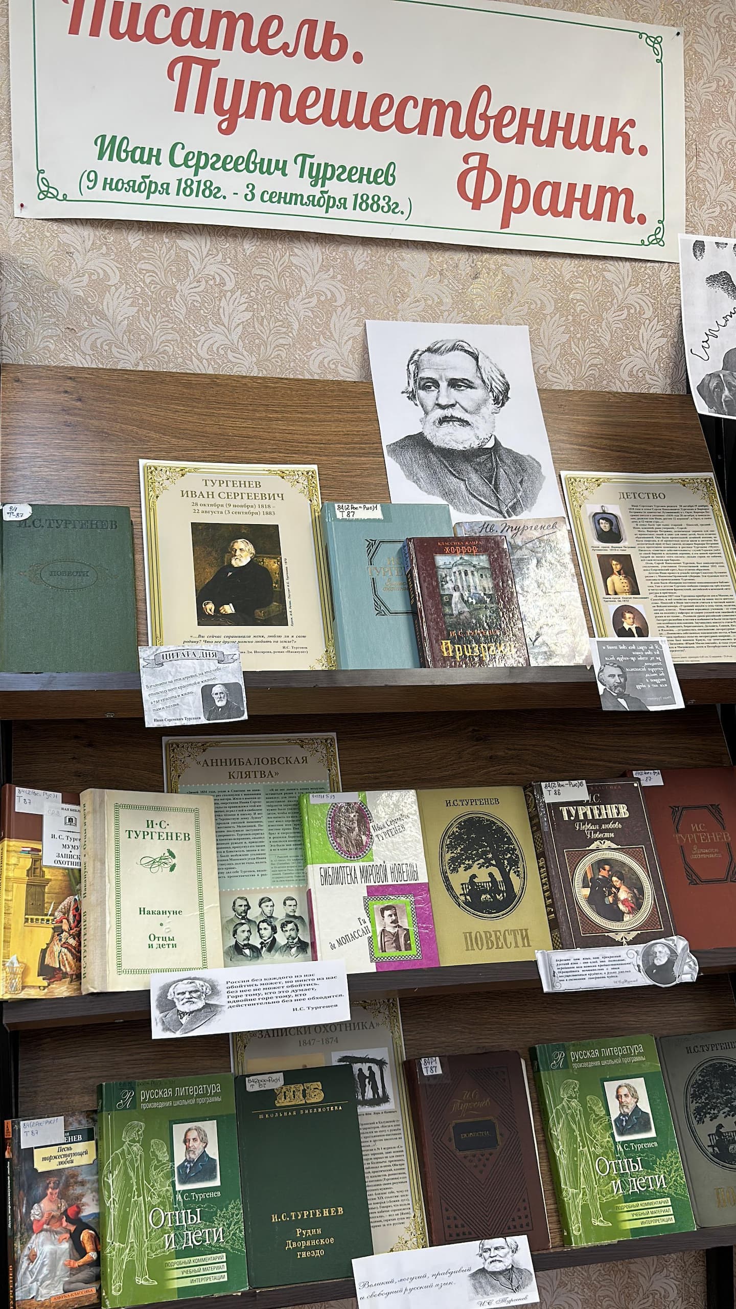 Для читателей была подготовлена книжная выставка под названием «Писатель. Путешественник. Франт.», где были представлены самые известные произведения Тургенева: «Отцы и дети», «Муму», «Ася», «Первая любовь» и другие. Ученики 6 «Б» класса ГБОУ «Лицей МКШ им. В. Н. Челомея» с интересом рассматривали книги, иллюстрации и высказывания писателя о литературе, обществе и человеке.