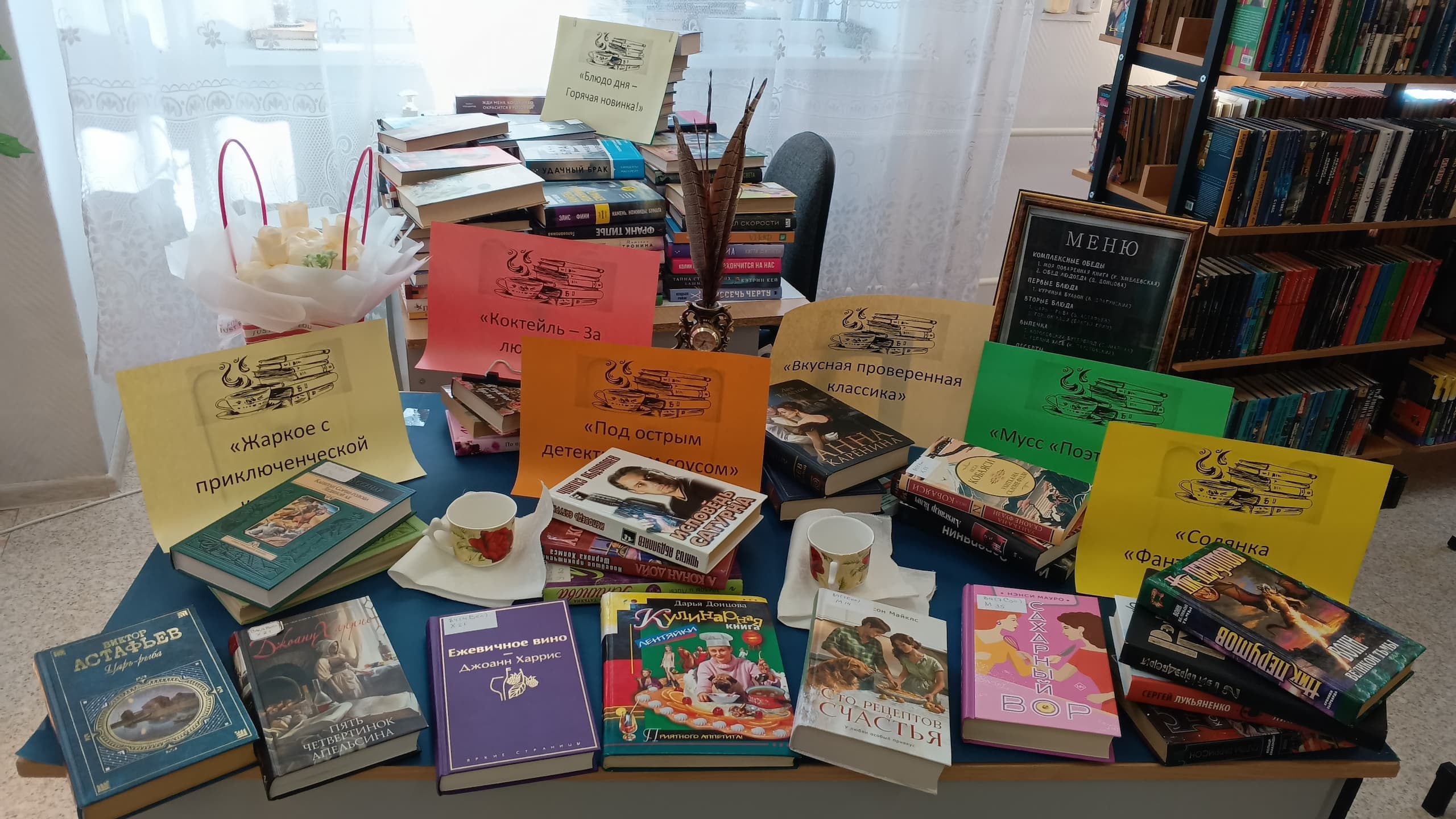 Была подготовлена фотозона у «Плаката пожеланий» и ярко оформлена книжно-иллюстративная выставка «Литературное кафе», где книги — это пища для сердца и ума, по- настоящему «вкусная», когда читаешь и получаешь истинное наслаждение.