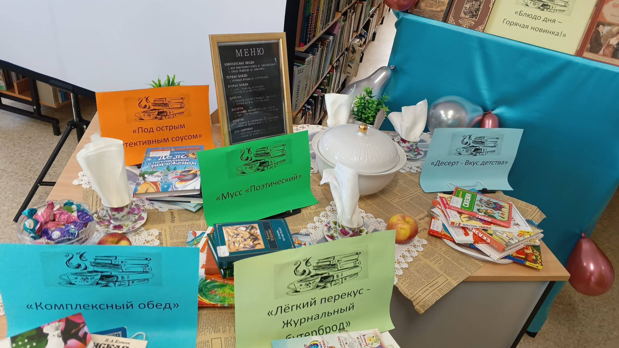 Была подготовлена фотозона у «Плаката пожеланий» и ярко оформлена книжно-иллюстративная выставка «Литературное кафе», где книги — это пища для сердца и ума, по- настоящему «вкусная», когда читаешь и получаешь истинное наслаждение.